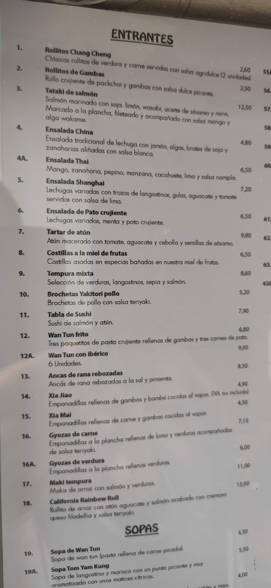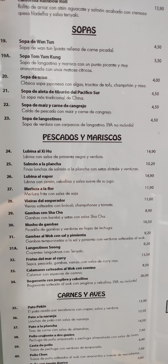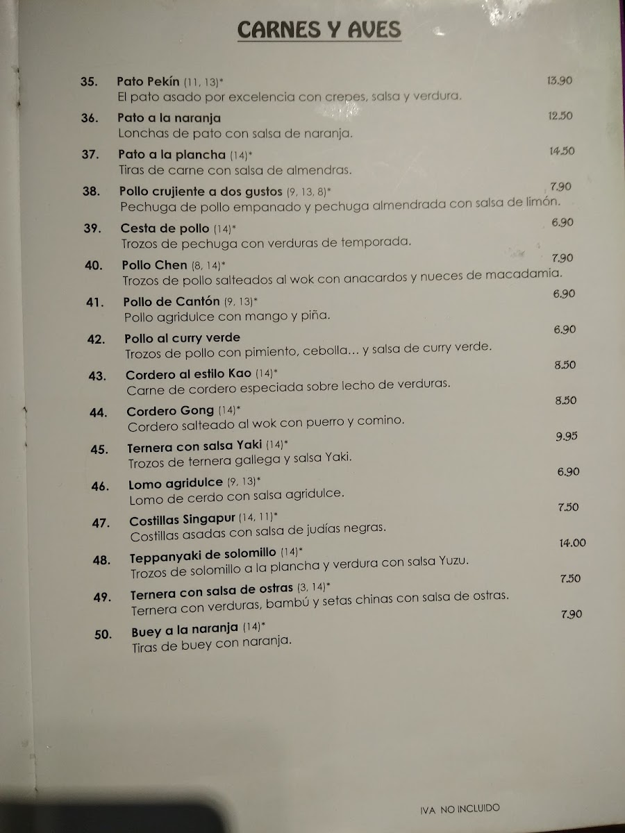 - Carnes Y Aves: Indulge in dishes like the succulent Pato Pekín, perfectly complemented with crepes, or the aromatic Cordero salteado al wok.